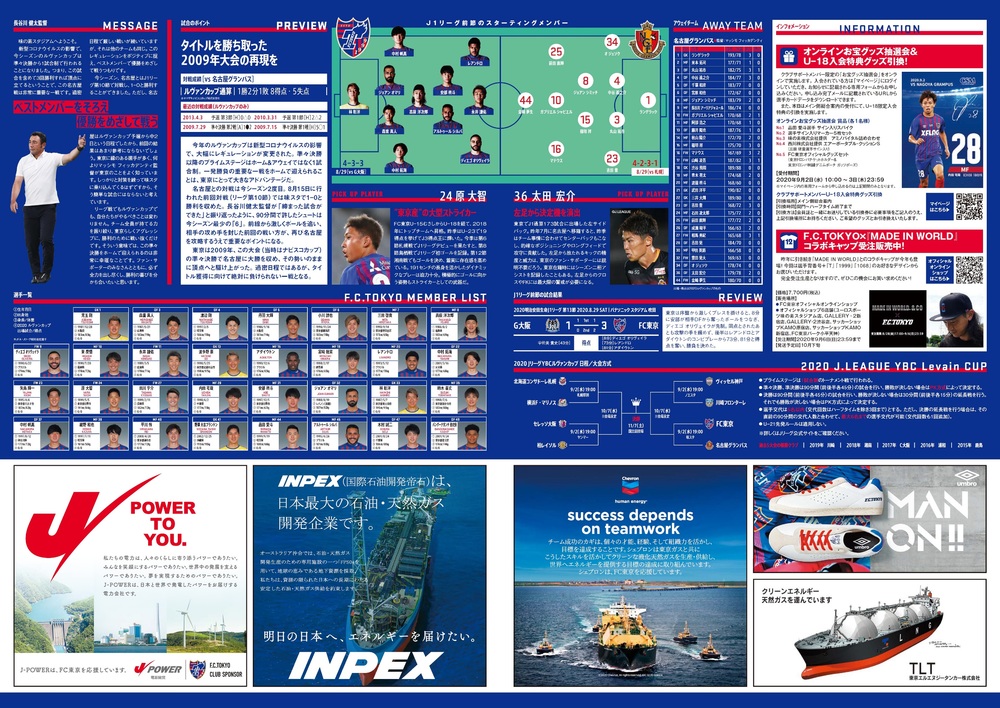 9/2(周三) 2020J聯賽YBC Levain盃 主要階段 八強賽 對 名古屋Grampus(19:00開球/味之素體育館)的官方比賽日程表,現公告如下。