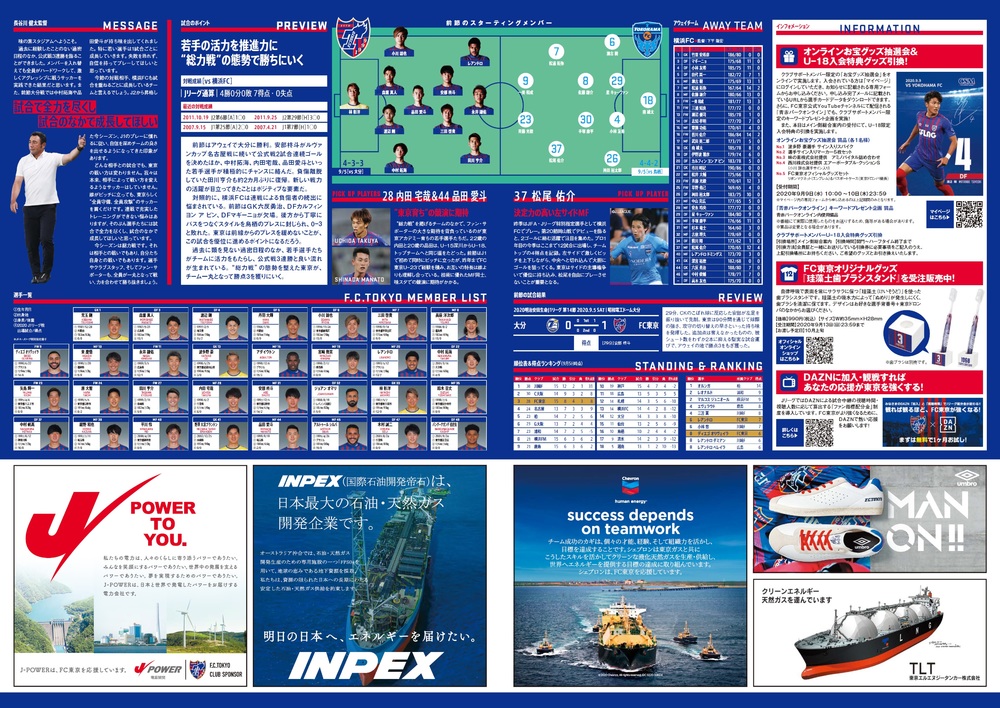 9/9(周三) 橫濱FC戰 官方比賽日程節目 2020/9/8 比賽資訊 9/9(周三) 2020明治安田生命J1聯賽 第15節 vs 橫濱FC(19:00開球/味之素體育館)的官方比賽日程節目,現公告如下。 □官方比賽日程2020 (封面:原大智 選手)・頁數:B4尺寸(對摺)4頁・發放地點:主看台3門、北看台2門・發放數量:4,000份※也可從頁面底部的PDF查看。 ◇9/9(周三) 橫濱FC戰比賽資訊請見這裡 ▽以PDF格式查看請點此 官方比賽日程節目(0909#15橫濱FC).pdf