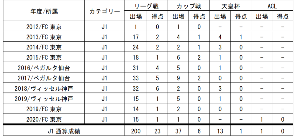 ※ 2009年以明治大學身份出場天皇盃4場比賽,攻入2球