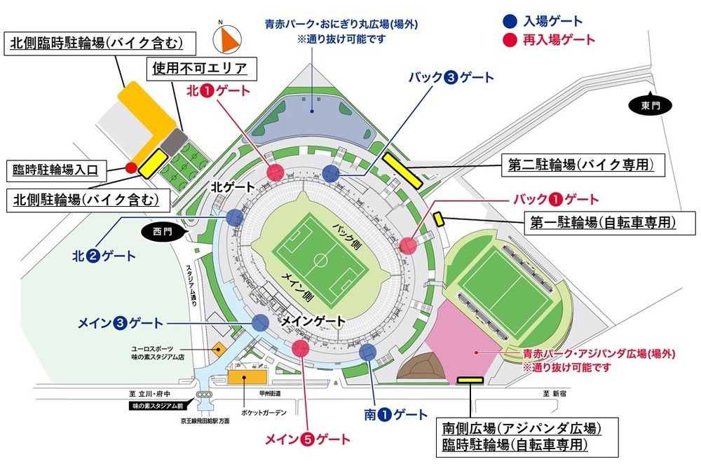 【味之素體育館公告】12/19(周六)神戶戰自行車及機車停放處相關資訊 2020/12/15 來自俱樂部的通知 由於「東京2020奧林匹克及帕拉林匹克運動會」延期舉辦,北側自行車停放區部分區域將無法使用,敬請注意。造成您的不便,敬請見諒並感謝您的理解。 □適用比賽・12/19(周六) vs Vissel神戶(14:00開球/味之素體育館) □可使用區域(請參考下方)・北側自行車停車場(含機車)・北側臨時自行車停放區(含機車)・第一停車場(自行車專用)・第二停車場(機車專用)・南側廣場臨時自行車停放處(僅限自行車)