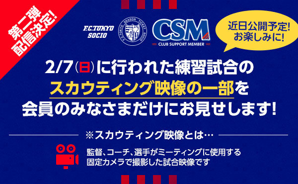 2/3(周三)的練習賽影像限定公開後,2/7(周日)進行的練習賽京都SANGA體育場F.C.戰的偵查影像部分,將於近期限定期間內提供給SOCIO及俱樂部支持會員觀看。