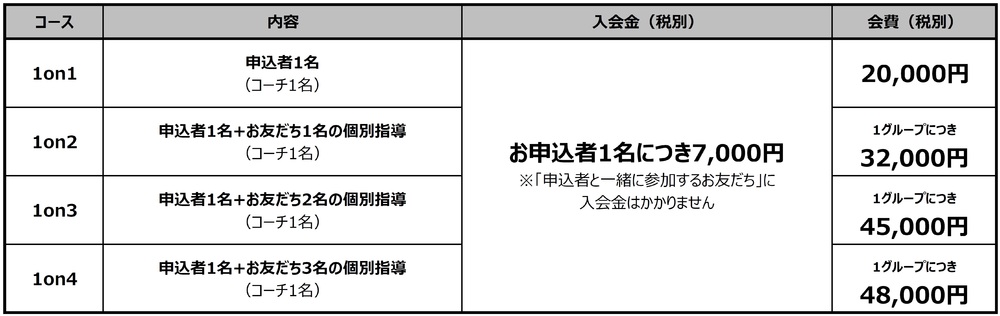※每次60分鐘的訓練,從一對一開始,最多可與朋友一起接受最多4人的指導。