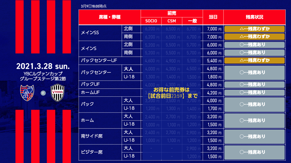 ※比賽當天不會在會場販售當日票。僅限於Ticket FC東京(J聯盟票券)販售。