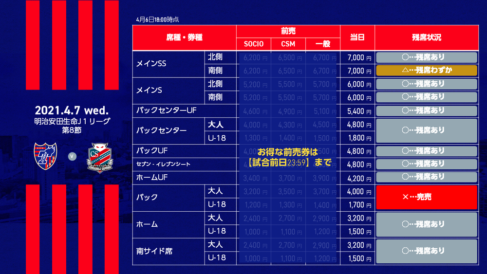 ※比賽當天不會在會場販售當日票。僅限於Ticket FC東京(J聯盟票券)販售。