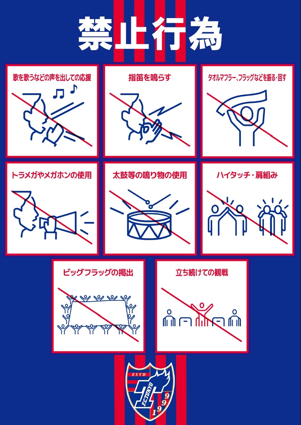 請遵守J聯盟統一禁止規則(J聯盟共通觀賽禮儀與規則)及FC東京足球比賽運營管理規定,以及「J聯盟 新型冠狀病毒感染症應對指引」。