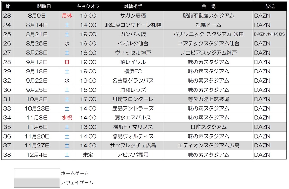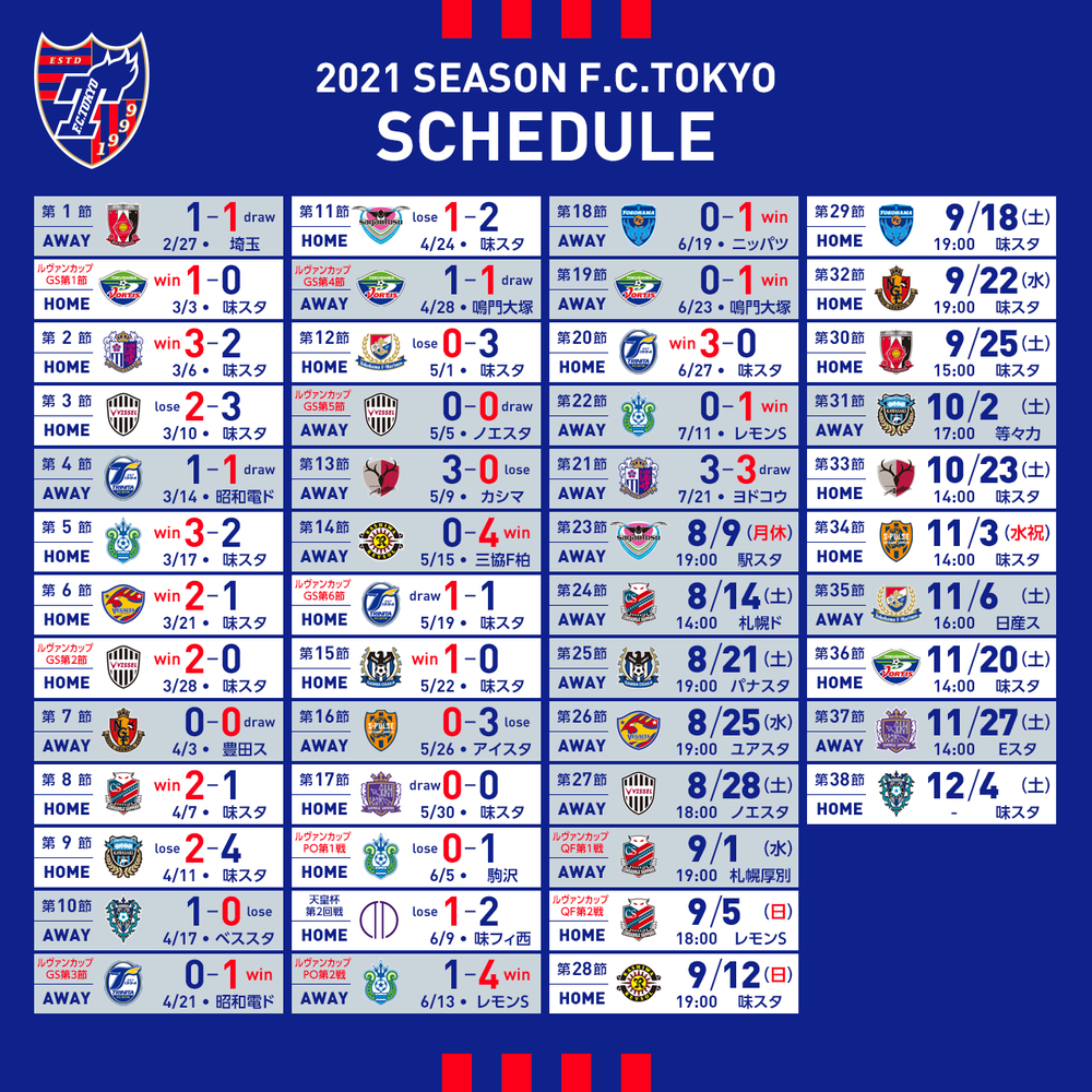 2021明治安田生命J聯賽 下半賽程發表通知 2021/8/4 來自俱樂部的通知 關於2021明治安田生命J1聯賽下半季賽程,已決定如下,特此通知。 □2021明治安田生命J1聯賽 此外,關於2021賽季後半年的門票,俱樂部曾考慮過銷售,但基於目前的各種情況,決定不進行銷售,特此通知。對於正在考慮購買的各位,我們深感抱歉,並希望您能夠理解。