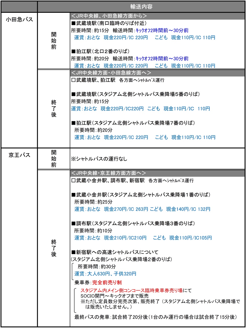 11月3日(周三祝) 2021明治安田生命J1聯賽 第34節 vs 清水S-Pulse(14:00開球/味之素體育館)將提供臨時交通接駁(鐵路)、接駁巴士及路線巴士的相關資訊。