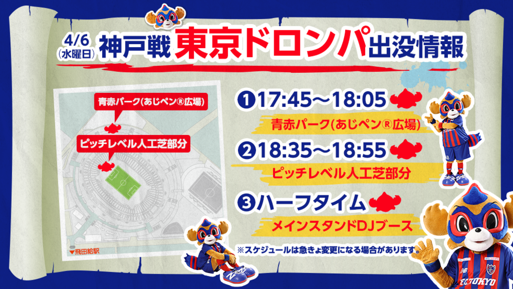 4月6日(周三) 2022明治安田生命J1聯賽 第7節 vs Vissel神戶(19:00開球/味之素體育館) TOKYO DOROMPA將如以下所示出現。