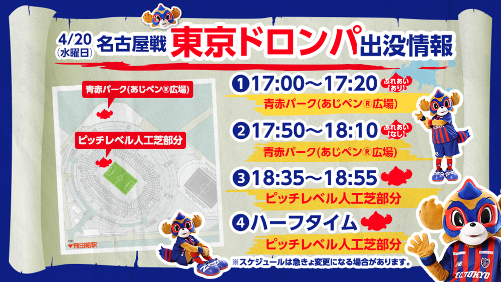 4月20日(周三) 2022明治安田生命J1聯賽 第2節 vs 名古屋Grampus(19:00開球/味之素體育館)中,TOKYO DOROMPA將如以下所示出現。
