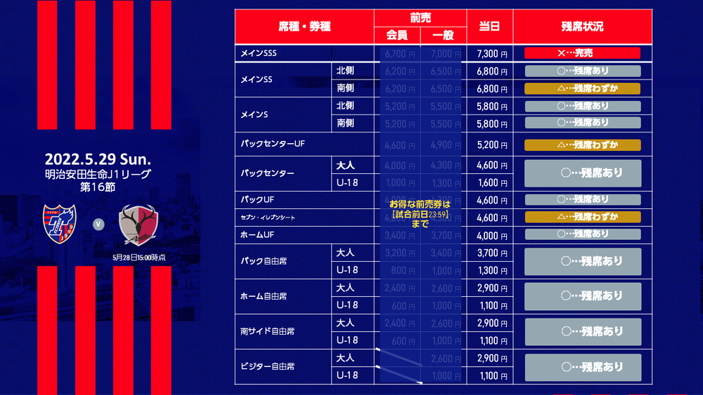 ※比賽當天不會在會場販售當日票。僅限於Ticket FC東京(J聯盟票券)販售。