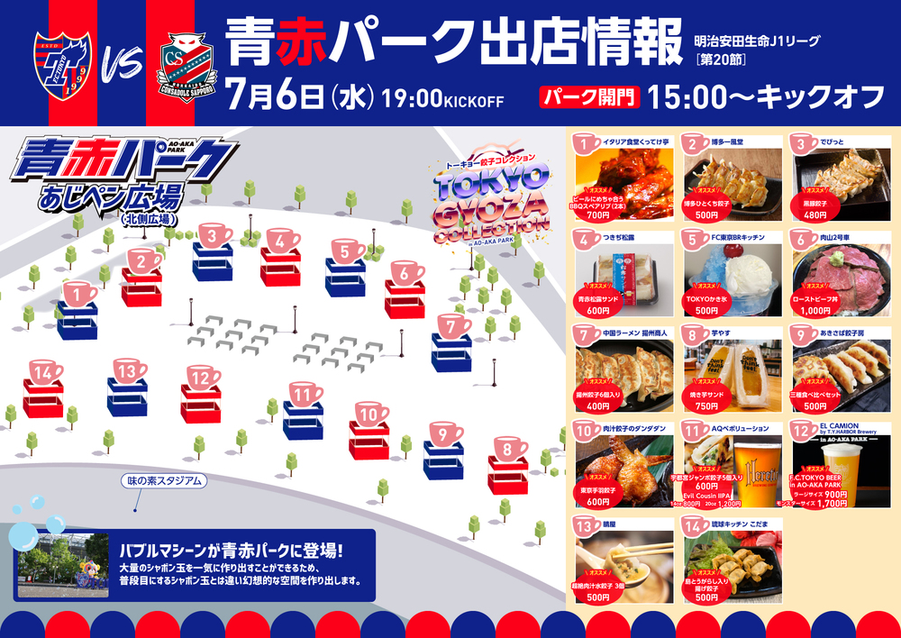 7月6日(周三) 2022 明治安田生命J1聯賽 第20節 vs 北海道Consadole札幌(19:00開球/味之素體育館)的AO-AKA PARK舉辦「TOKYO GYOZA COLLECTION」!