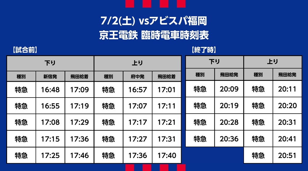7月2日(周六) 2022明治安田生命J1聯賽 第19節 vs Avispa福岡(18:00開球/味之素體育館)將提供臨時交通接駁(鐵路)、接駁巴士及路線巴士的相關資訊。