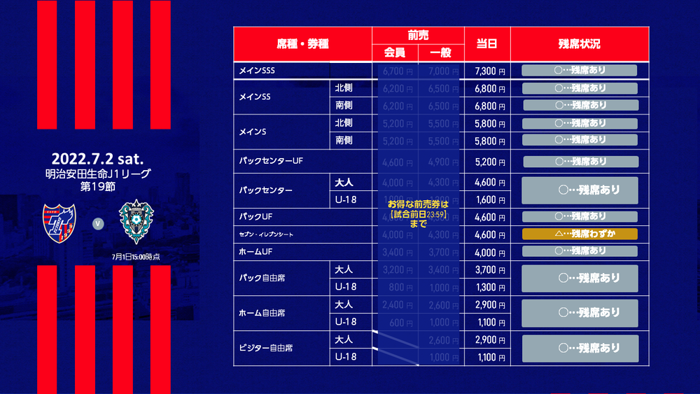 ※比賽當天不會在會場販售當日票。僅限於Ticket FC東京(J聯盟票券)販售。