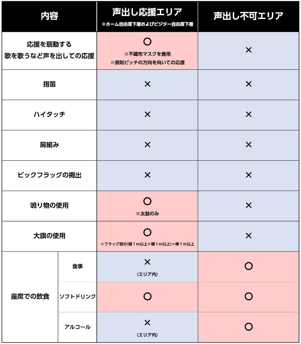 吹口哨等可能導致飛沫傳播風險的應援、擊掌・肩並肩等與人接觸的應援、以及大型旗幟等造成群聚的應援在所有區域均被禁止。