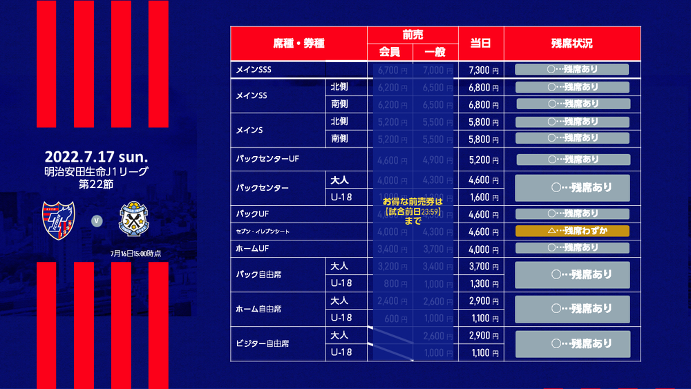 ※比賽當天不會在會場販售當日票。僅限於Ticket FC東京(J聯盟票券)販售。
