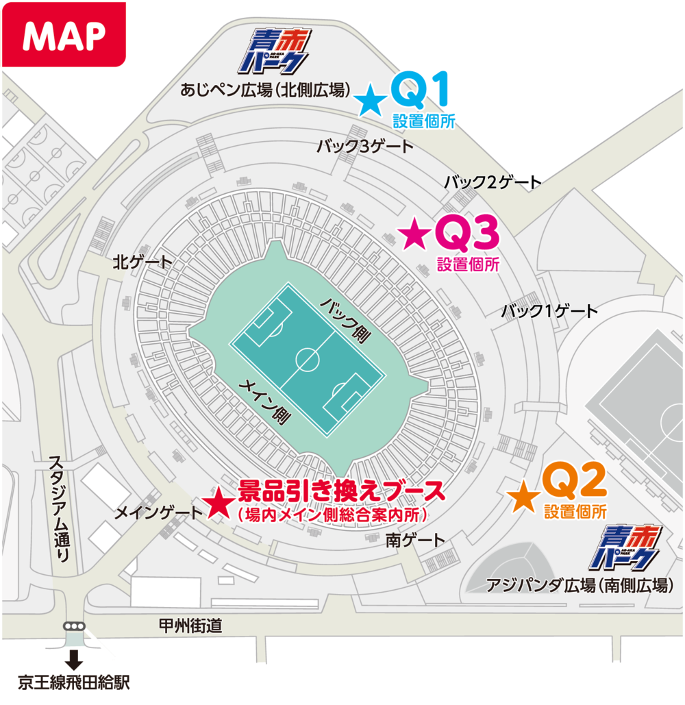 在あじペン®廣場・アジパンダ廣場・場內後方走廊這三個設置有關FC東京的問答處回答問題,並將答題紙帶到獎品兌換處的朋友,將贈送TOKYO DOROMPA原創貼紙作為禮物。