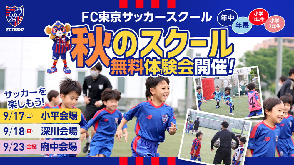FC東京將於9月17日(周六)、18日(周日)、23日(周五祝)在東京都內各球場舉辦針對全年齡至小學2年級學生的「學校體驗會」。