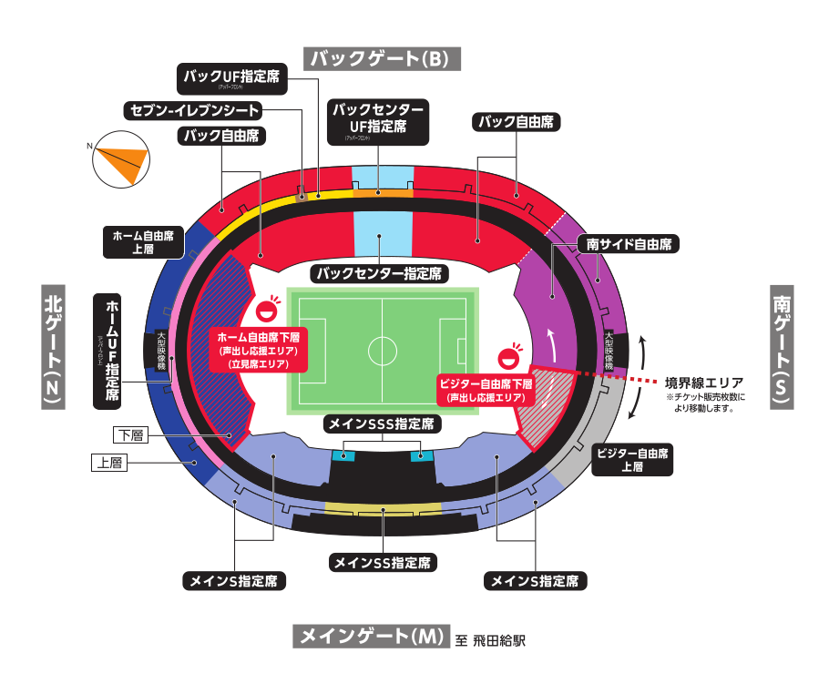 ※入場券兌換開始及銷售開始後,一旦達到聲援區域的上限席位數,即停止兌換及銷售。如在入場券兌換開始日即達上限,將不再販售門票。此外,未取得入場券的主場自由席SOCIO會員,請於主場自由席上層觀賽,或依下方【5.】所述更換至後方自由席觀賽。