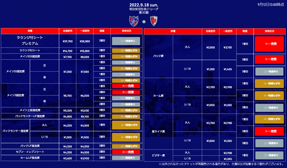 9月18日(周日)2022明治安田生命J1聯賽第30節對京都SANGA體育場F.C.比賽(19:00開球/日本國立體育場)的預售票販售,現公告如下。