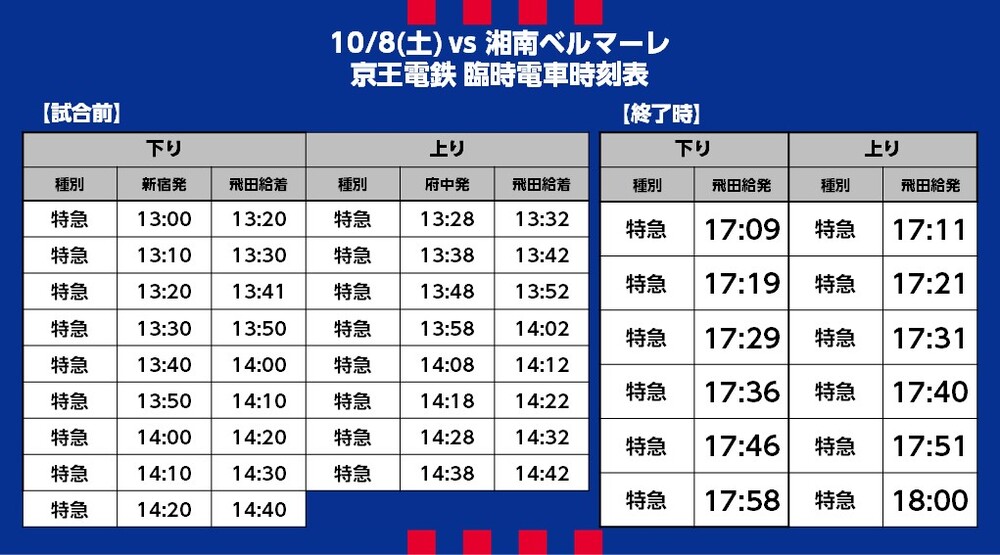 10月8日(周六) 2022明治安田生命J1聯賽 第32節 vs 湘南Bellmare(15:00開球/味之素體育館)將提供臨時交通接駁(鐵路)、接駁巴士及路線巴士的相關資訊。