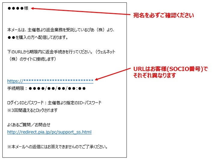 11月8日(周二)起將陸續從「refundss@pia.co.jp」寄送進行手續所需的電子郵件。請從電子郵件中記載的URL登入。