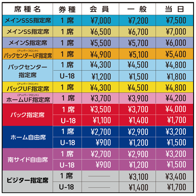 ※可穿著訪客隊球衣、周邊商品及為訪客隊加油的席位為上述「主看台SS指定席 南側」、「主看台S指定席 南側」、「訪客指定席」三種席位,其他席位皆為FC東京的應援席。