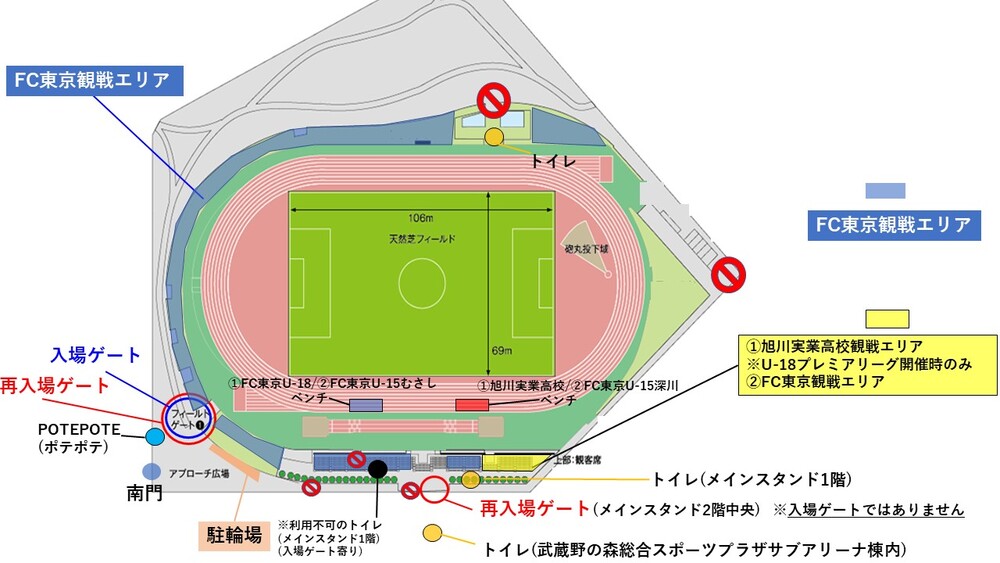 ※請從再入場閘口主看台中央閘口出來後,使用武藏野之森綜合運動廣場副競技場棟內指定的廁所。