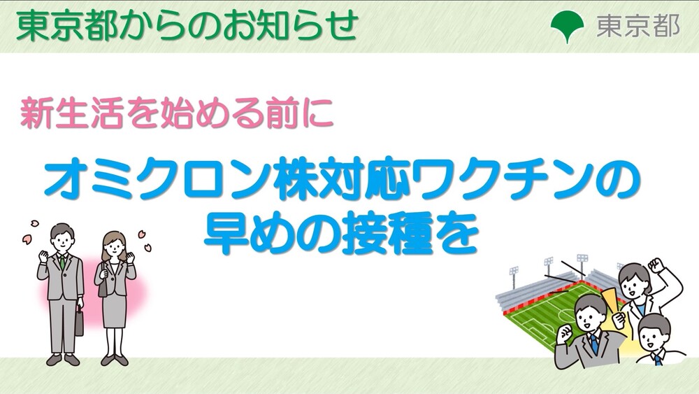 目前,東京都正努力推動自令和4年秋季開始的Omicron株對應疫苗接種。Omicron株對應疫苗在預防重症化方面優於傳統疫苗,且預期對未來變異株的效果也高於傳統疫苗。尚未接種者,請把握此機會考慮接種。此外,令和5年度所有人皆可免費接種新冠疫苗。
