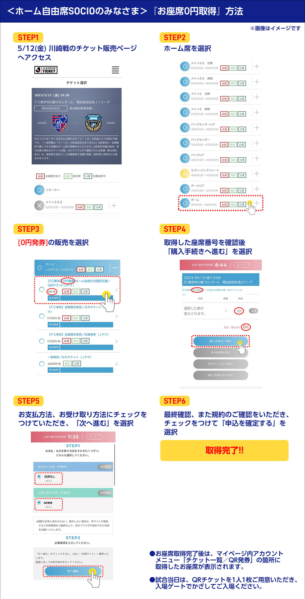 請於FC東京購票系統進行「座位0元取得」。需事先取票,無法使用SOCIO卡直接入場,敬請見諒。