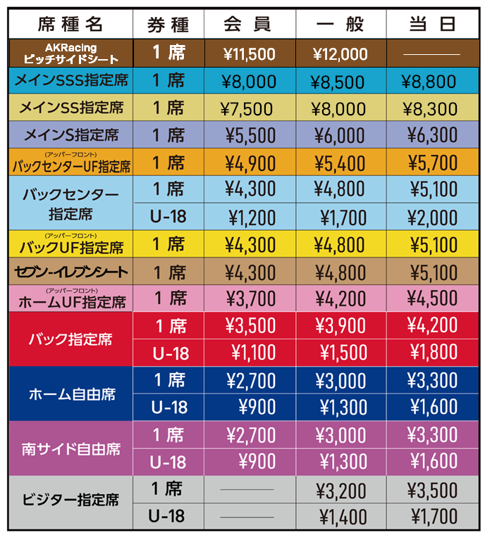 ※可穿著訪客隊球衣、周邊商品及為訪客隊加油的席位為上述「主看台SS指定席 南側」、「主看台S指定席 南側」、「訪客指定席」三種席位,其他席位皆為FC東京的應援席。