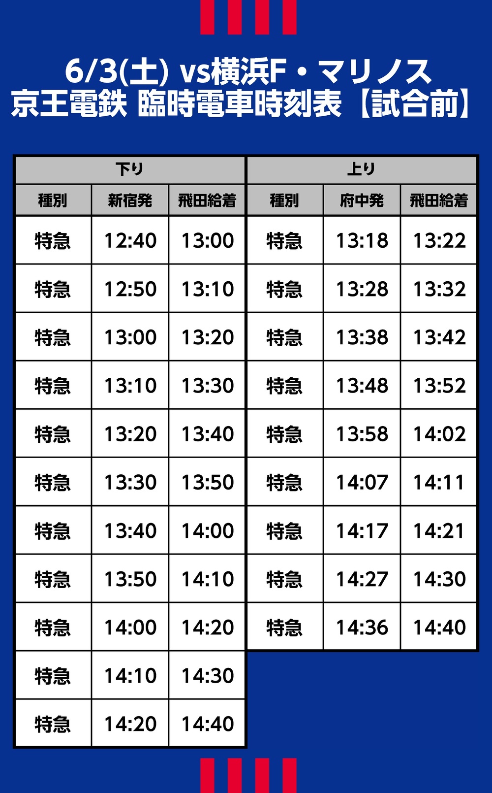 6月3日(周六) 2023明治安田生命J1聯賽 第16節 vs 橫濱FMarinos(15:00開球/味之素體育館)將提供臨時交通接駁(鐵路)、接駁巴士及路線巴士的相關資訊。