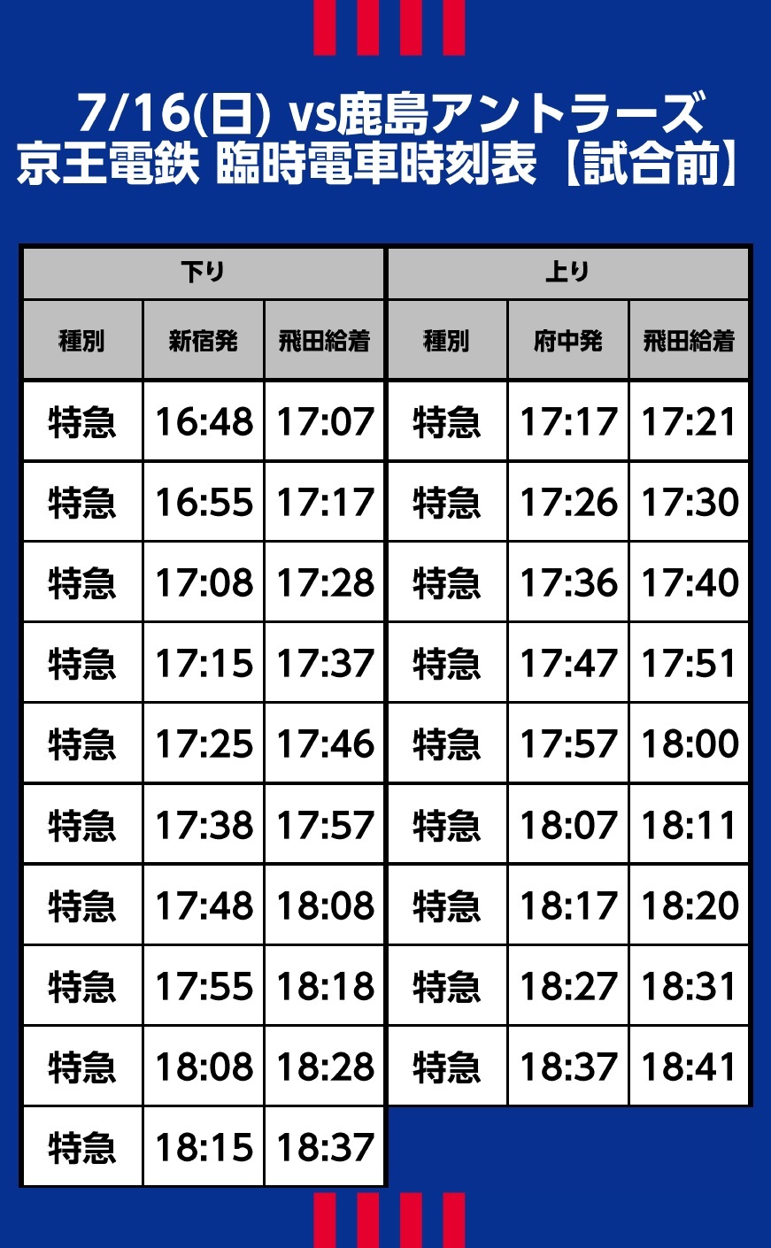 7月16日(周日) 2023明治安田生命J1聯賽 第21節 vs 鹿島Antlers(19:00開球/味之素體育館)將提供臨時交通接駁(鐵路)、接駁巴士及路線巴士的相關資訊。