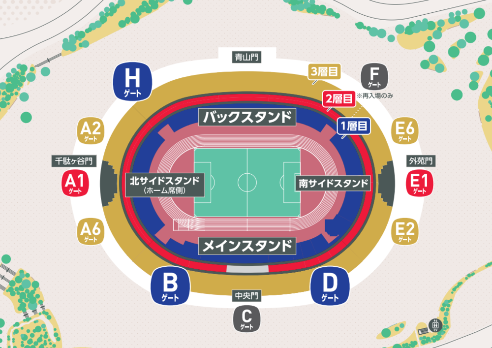 依票券種類不同,入場閘門也會有所不同。請從符合您票券種類的閘門入場。即使是相同的座位種類,北側、南側及樓層不同,入場閘門也會有所差異,請特別注意。