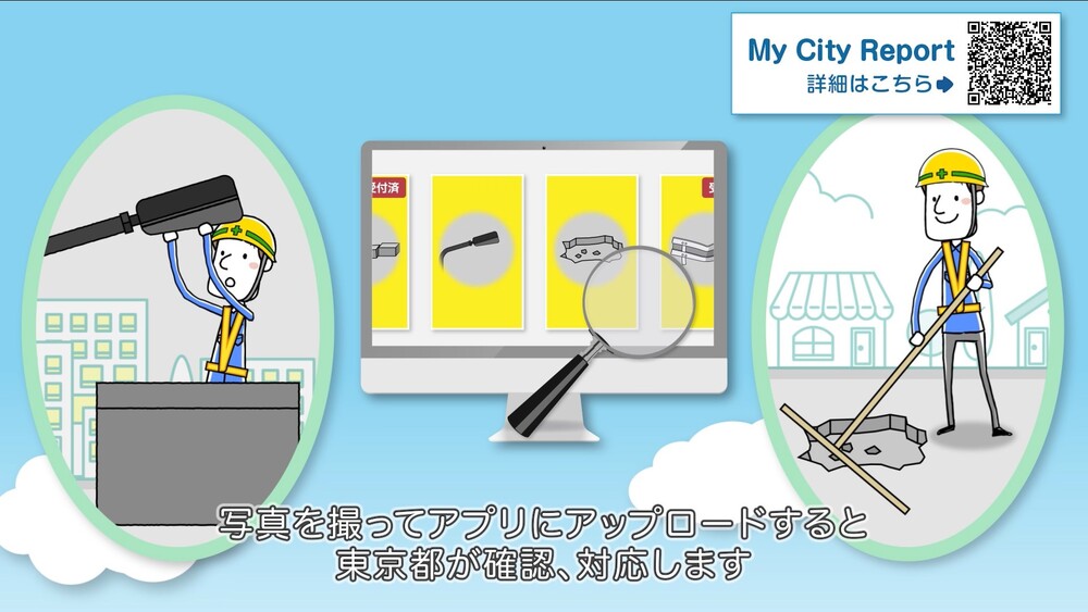 道路通報系統「My City Report for citizens(以下稱「MCR」)」是一款智慧型手機應用程式,讓東京都民能夠即時在現場回報道路損壞或故障,簡言之,就是「道路上的困擾!」。使用者可拍攝「人行道不平整的磚塊」或「消失的街燈」等照片並上傳,系統會連同位置資訊一併傳送至東京都。收到的道路損壞或故障通報,將視情況進行修繕等處理。應用程式可24小時隨時投稿。我們將根據大家的通報,進行細緻的道路管理,進一步提升安全性,提供安心且舒適的道路環境。