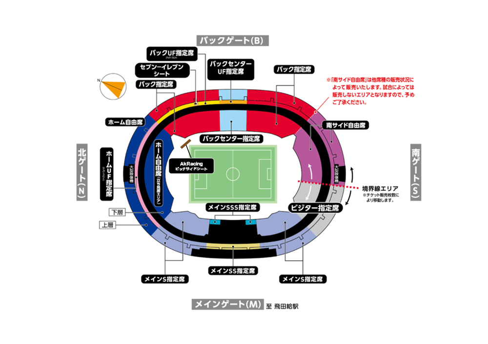 ※可穿著訪客隊球衣、周邊商品及為訪客隊加油的席位為上述「主看台SS指定席 南側」、「主看台S指定席 南側」、「訪客指定席」三種席位,其他席位皆為FC東京的應援席。