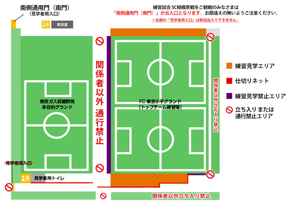 ・因舉辦「高円宮杯 JFA U-18足球頂級聯賽2023 EAST第19節」,欲觀賞頂級隊伍練習賽的觀眾,請從南側通用門(南門)進出。請注意不要走錯。