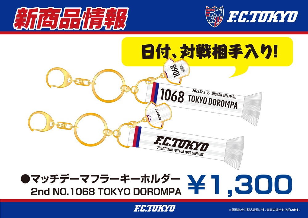 12月3日(周日)2023明治安田生命J1聯賽對湘南Bellmare比賽的商品販售攤位因故取消,故自12月5日(周二)起,將於Euro Sports味之素體育館店面向湘南Bellmare比賽觀賽者販售客場限定圍巾鑰匙圈。