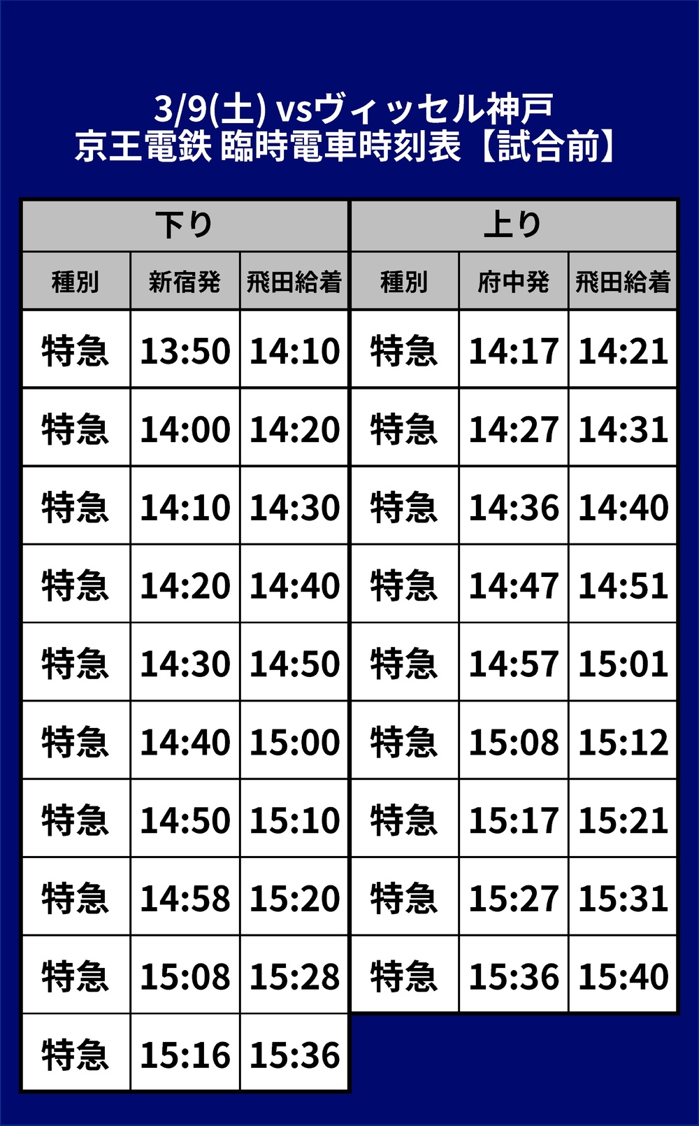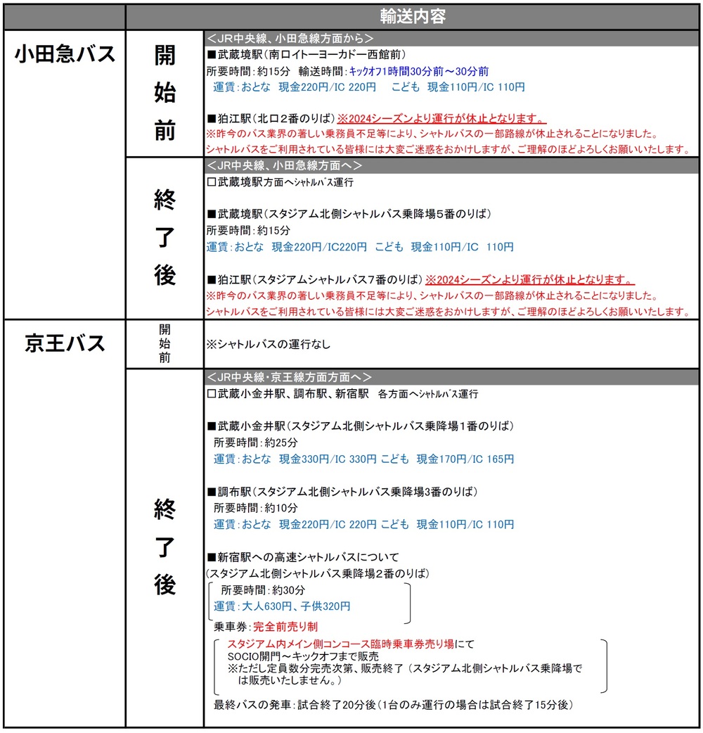 3月9日(周六) 2024明治安田J1聯賽 第3節 vs Vissel神戶(16:00開球/味之素體育館)將提供臨時交通接駁(鐵路)、接駁巴士及路線巴士的相關資訊。