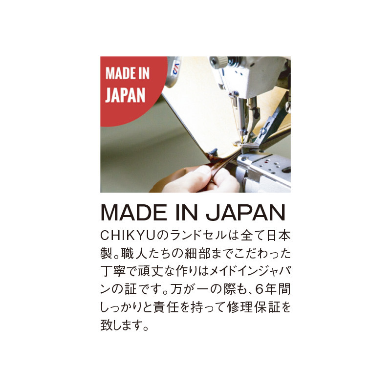 CHIKYU的書包全部為日本製。工匠們對細節的講究與細心且堅固的製作,是日本製造的證明。即使發生任何意外,我們也會負責任地提供六年的維修保證。