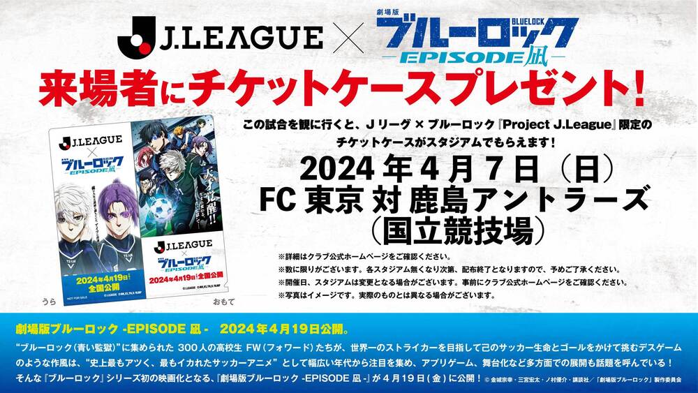 2024年4月7日(周日)2024明治安田J聯賽第7節 FC東京vs鹿島Antlers(17:00開球/日本國立體育場)將舉辦J聯賽×藍鎖『Project J.League』合作活動,作為4月19日(周五)預定公開電影『劇場版藍鎖 -EPISODE 凪-』的一部分。除了豪華嘉賓出席的座談會外,還有拍照景點及合作商品販售等,為足球迷與『藍鎖』粉絲們準備了豐富多彩的特別活動!
