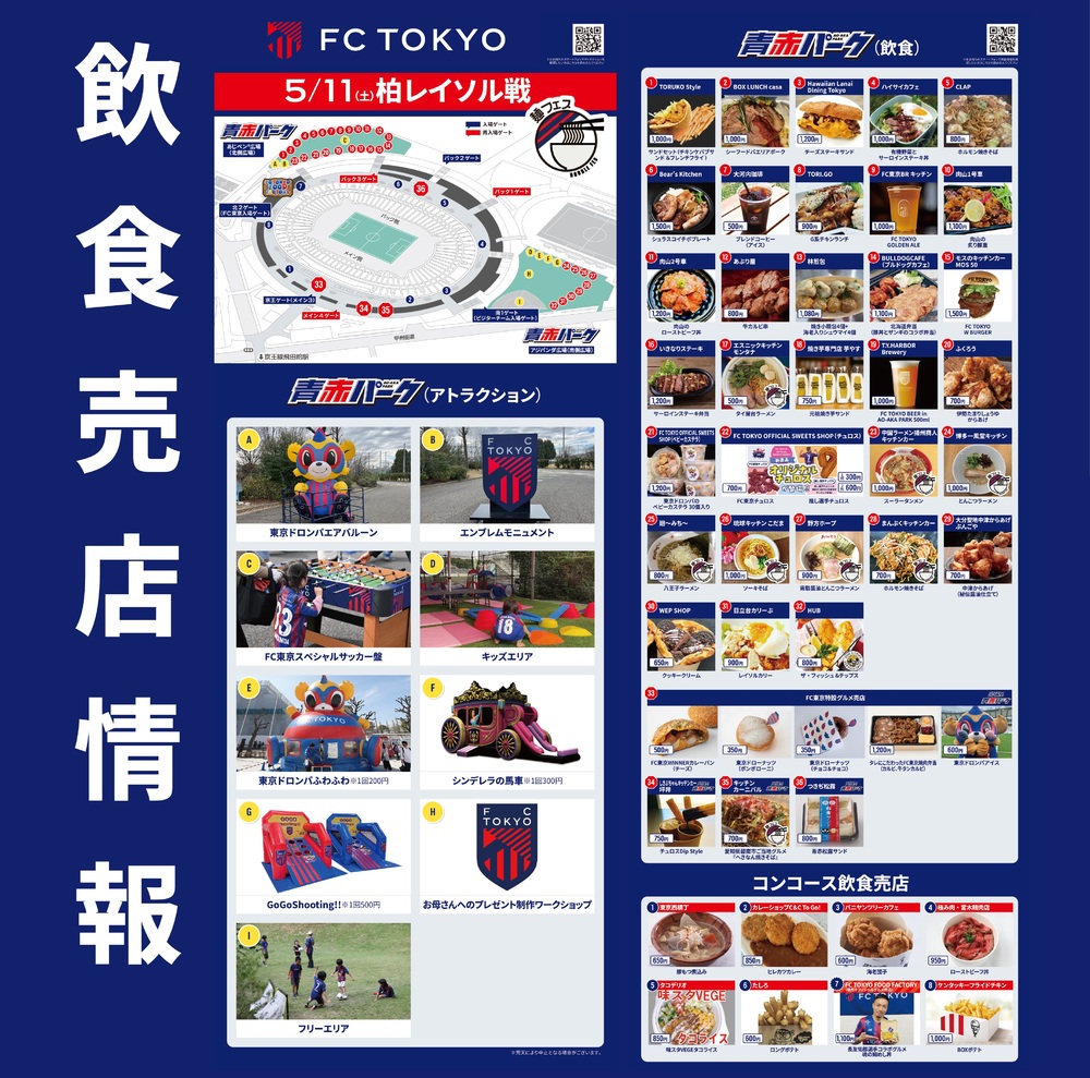 5月11日(周六)柏Reysol戰的AO-AKA PARK(場外)、出張!! AO-AKA PARK、體育館內通道(場內)販賣部的飲食資訊通知您。