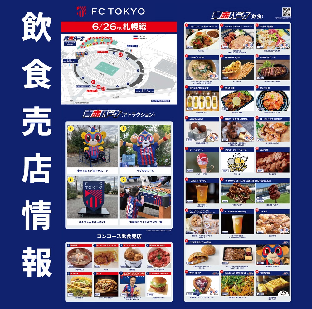6月26日(周三)北海道Consadole札幌戰的AO-AKA PARK(場外)、出張!!AO-AKA PARK、體育館內走廊(場內)販賣部販售的飲食資訊通知您。