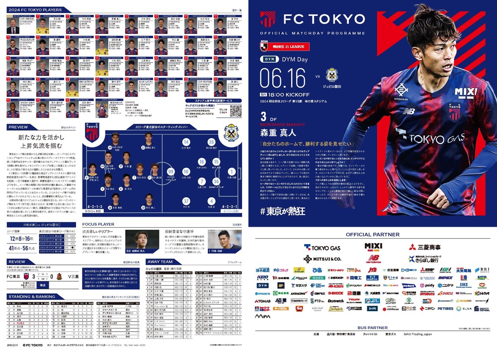 6/16(周日) 磐田戰 官方比賽日節目 2024/6/15 比賽資訊 6月16日(周日) 2024明治安田J1聯賽 第18節 vsJúbilo磐田(18:00開球/味之素體育館)的官方比賽日程節目,謹此通知如下。 □官方比賽日程2024</span></strong>【訪談】森重真人選手・頁數:B4尺寸(對折) 4頁※可從頁面底部的PDF查看。 ◇比賽資訊請點這裡 ▽以PDF格式查看請點此 20240616_磐田戰_比賽日程程式.pdf