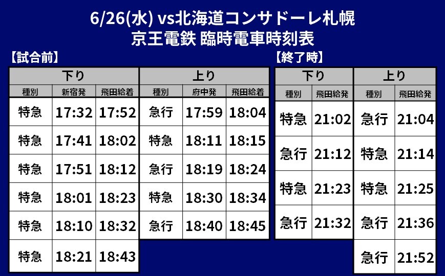 6月26日(周三) 2024明治安田J1聯賽 第20節 vs北海道Consadole札幌(19:00開球/味之素體育館)將提供臨時交通接駁(鐵路)、接駁巴士及路線巴士的相關資訊。