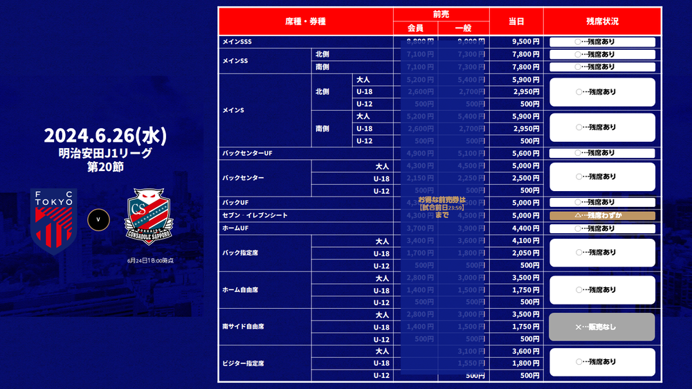 2024明治安田 J1聯賽 第20節 FC東京 對 北海道Consadole札幌(19:00開球/味之素體育館)的當日票販售,特此通知如下。