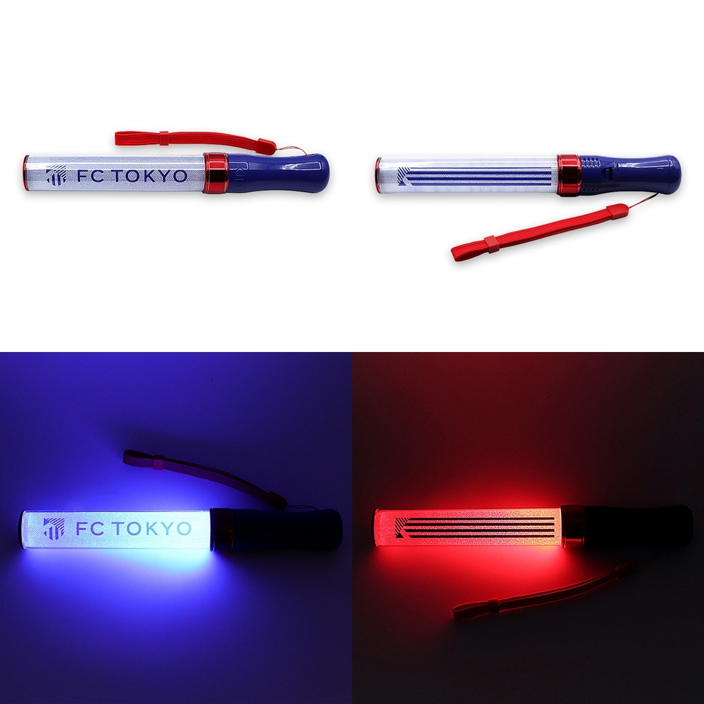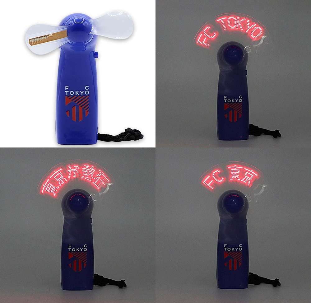 這是一款會投影「FC TOKYO」「東京熱狂」等訊息的發光小型風扇。尺寸適合手持,並附有掛繩,方便攜帶的商品!