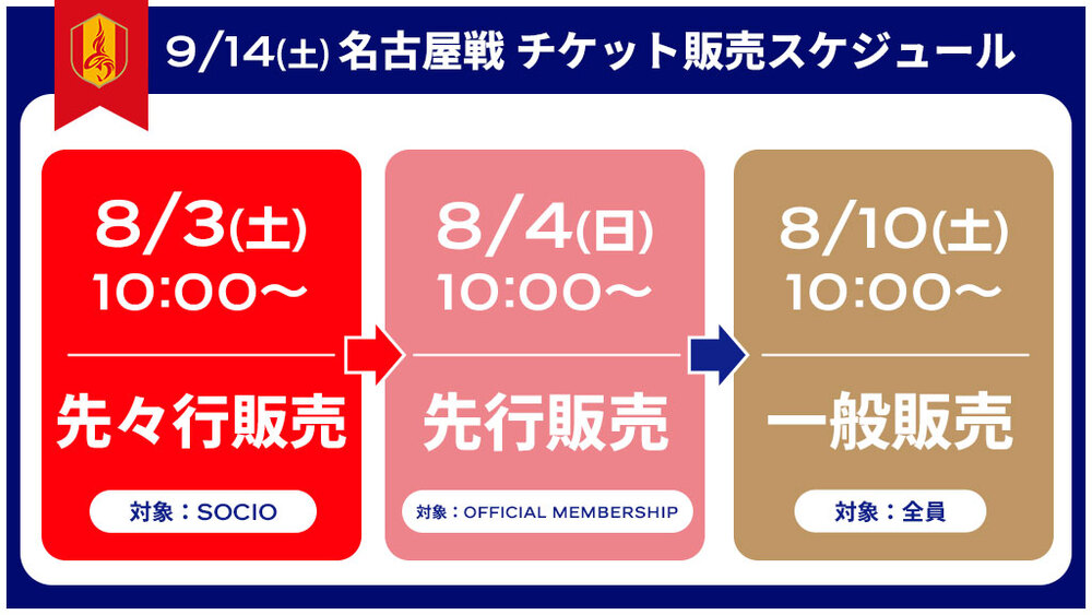 9月14日(周六) 2024明治安田J1聯賽 第30節 vs 名古屋Grampus(19:00開球/日本國立體育場)的票券販售相關通知。
