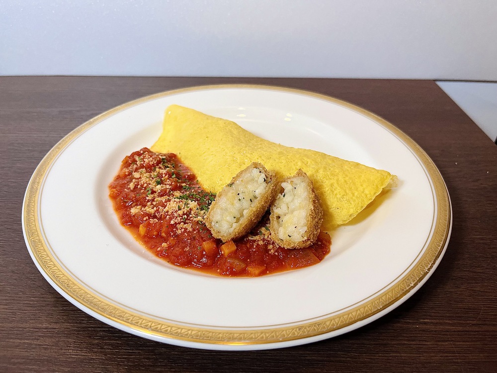 將起司燉飯的米飯可樂餅包裹在薄煎蛋中,並使用自家製的番茄與羅勒醬,做成佳史扶選手最喜愛的蛋包飯風味。