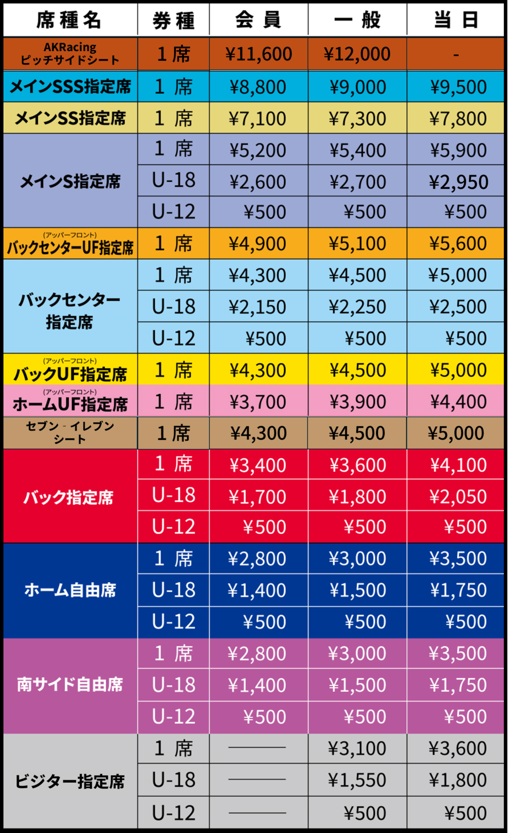 ※U-18票價適用於2006年4月2日以後出生者,U-12票價適用於2012年4月2日以後出生者。未就學兒童若坐在監護人膝上觀賽,則無需購票。