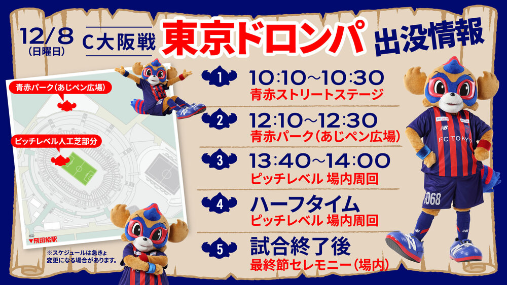 12月8日(周日) 2024明治安田J1聯賽 第38節 vs Cerezo大阪(14:00開球/味之素體育館)TOKYO DOROMPA將如以下所示現身。敬請期待!
